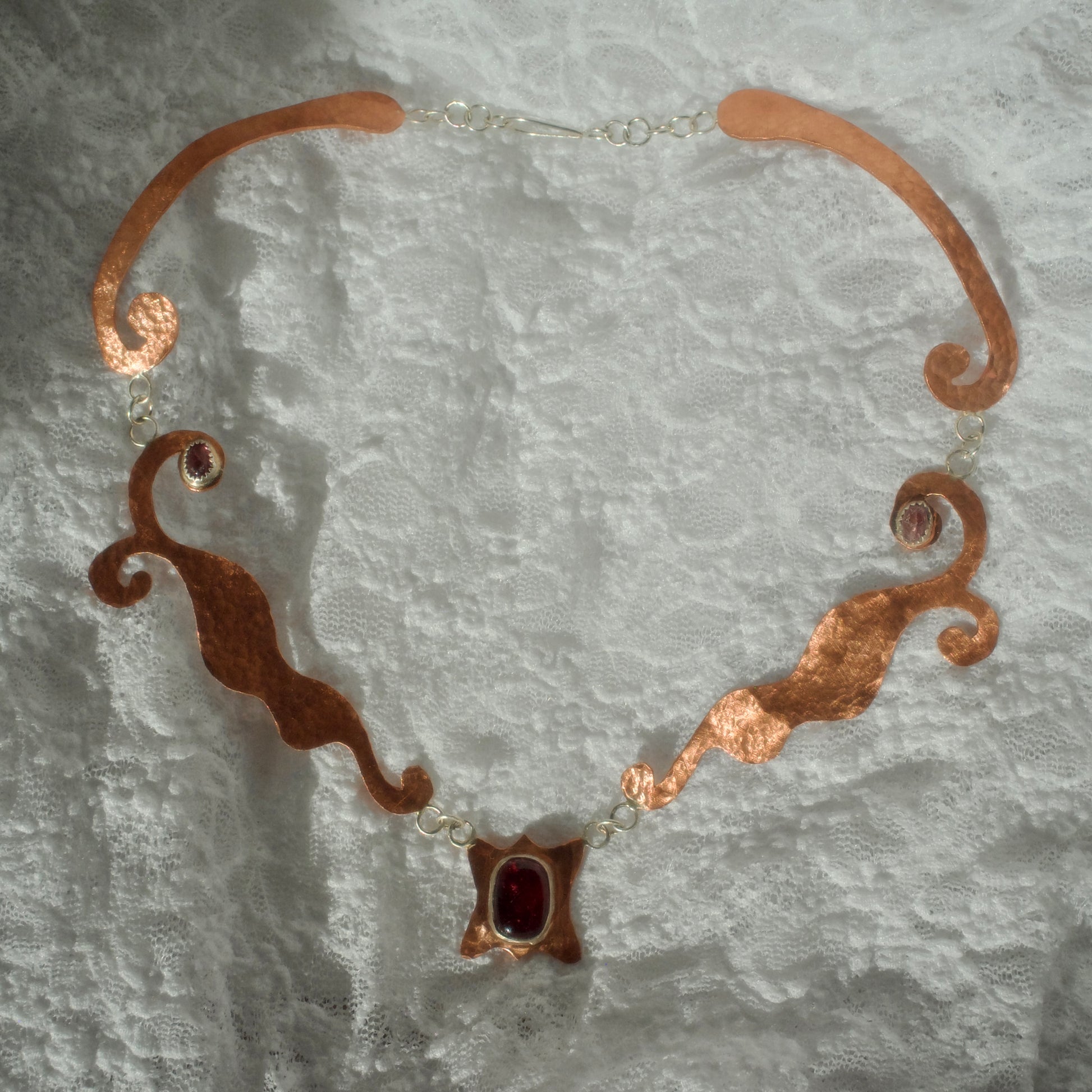 Behold! The Marigold necklace! This one of a kind statement piece features 3 tourmaline gemstones, textured copper sheet elements, and small hints of sterling silver throughout. Mixing metals is a fun way to mix colors and keep the overall price down! This necklace measures approximately 16” and is made to be a shorter necklace to sit over the collar bones. Length is slightly adjustable.