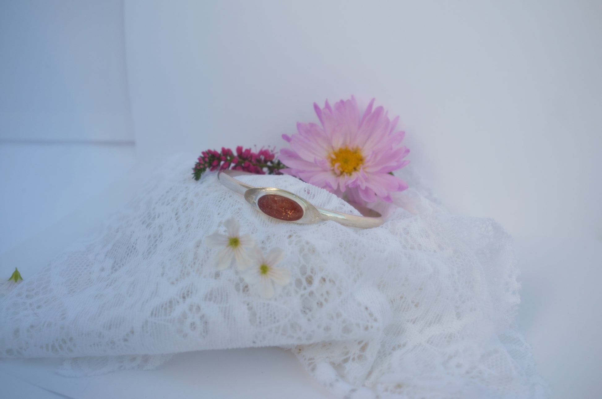 This maybe be one of my favorite gemstones to work with right now. Sunstone is an absolutely magical stone! It truly glimmers in the sunshine and embodies a fairy-like nature. This cuff features two star imprints alongside the stone and is set on a 925 sterling silver half-round wire cuff to make it very sturdy.