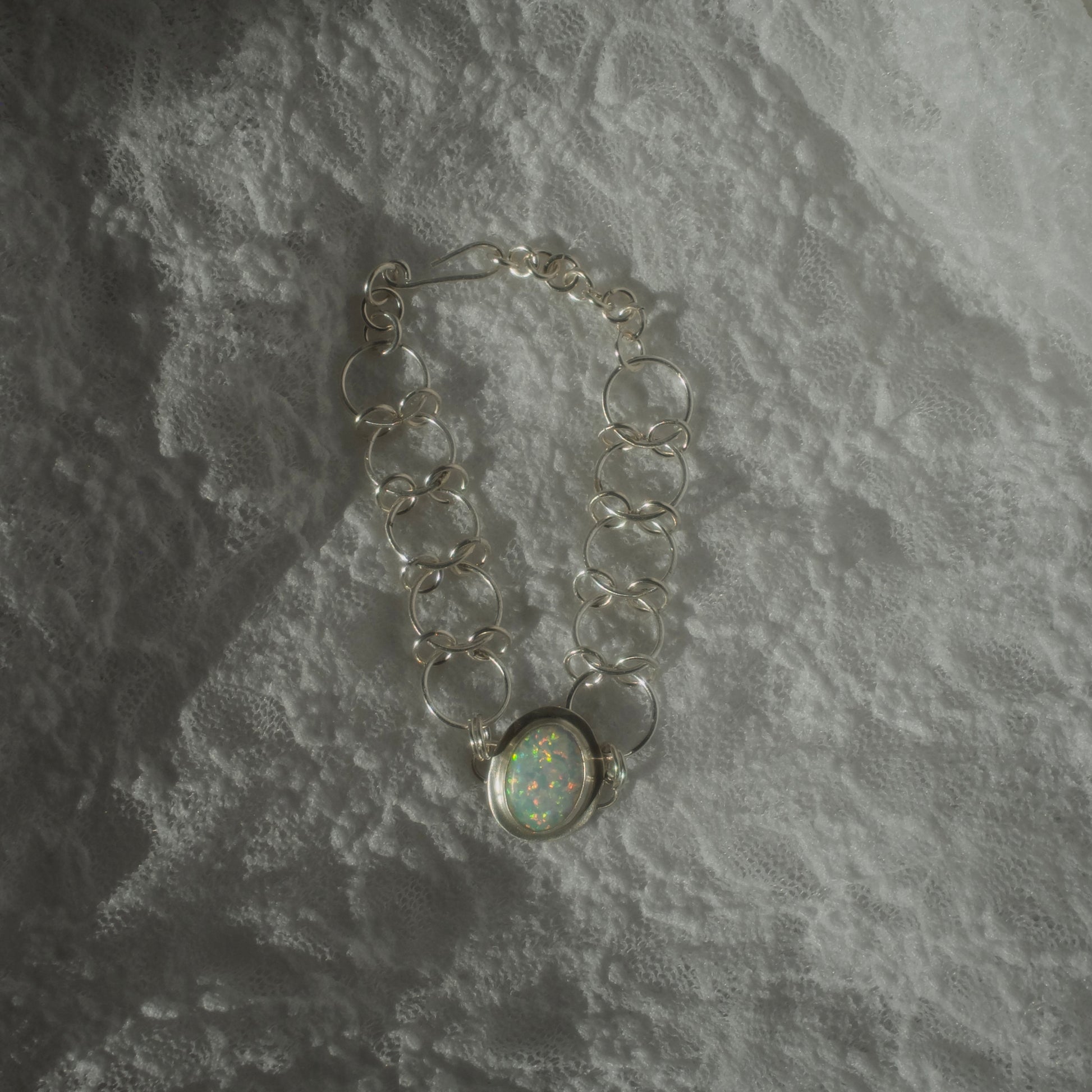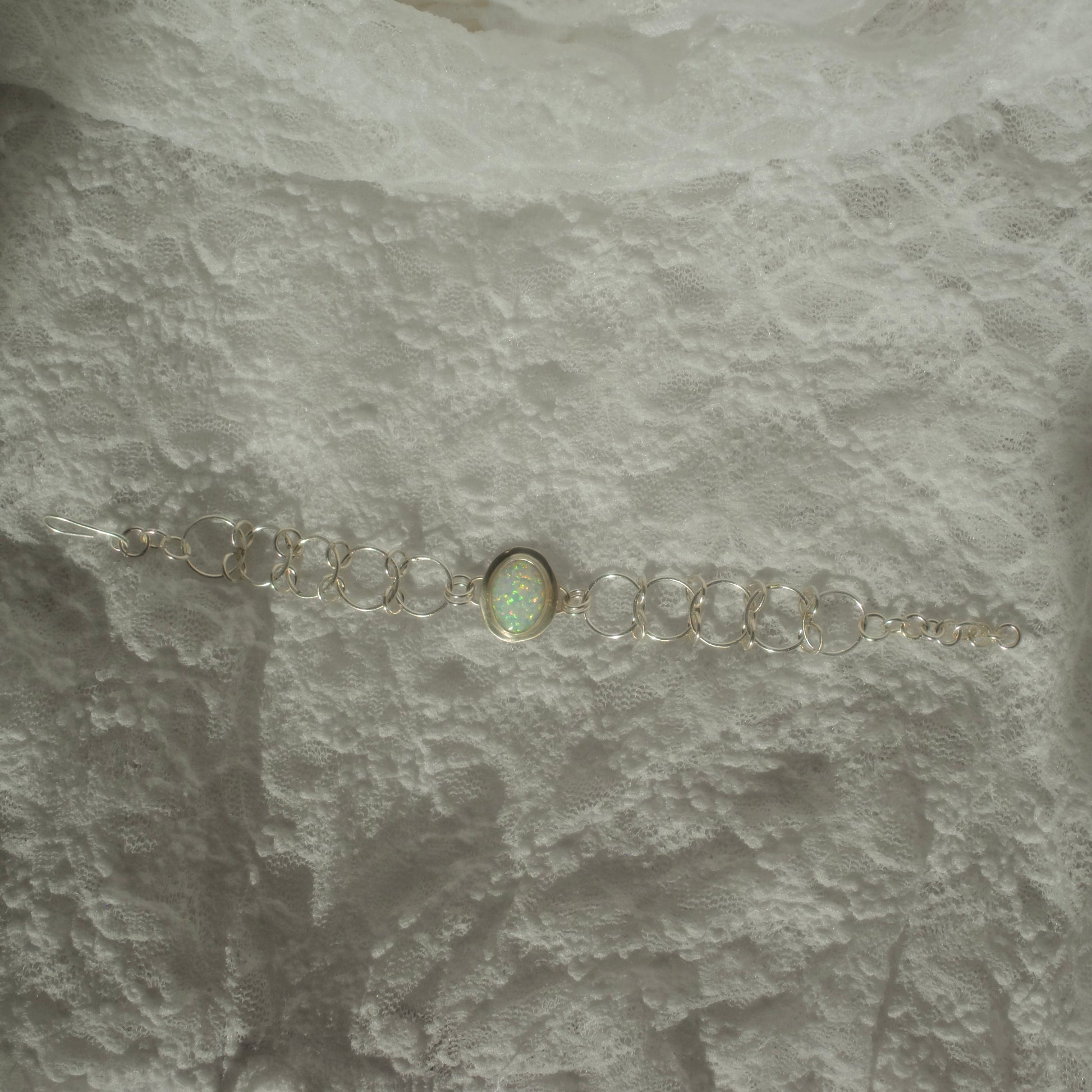 This is a handmade, fine silver chain bracelet featuring a glowing opal gemstone. It features an open clasp and is size adjustable.