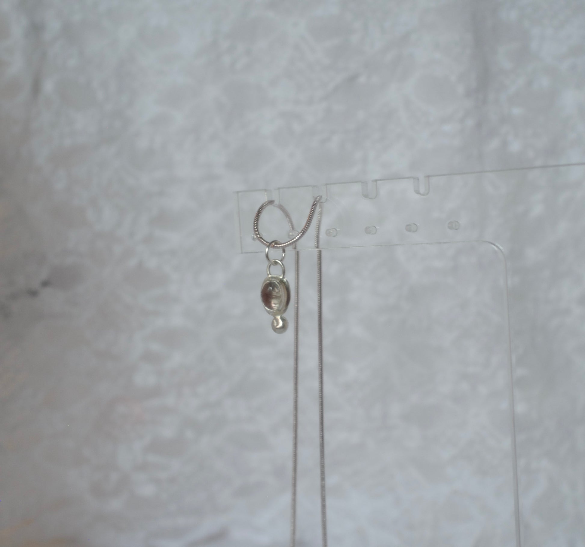 This sterling silver pendant features a beautiful bi-color tourmaline. It’s mostly clear but when flashed with some sunlight you’ll find some beautiful pink hues. It comes with a silver coated sliding adjustable necklace featured in the photos.